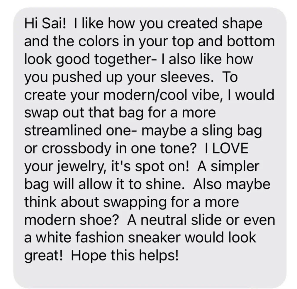 Real-time feedback: Most of the time, your style coach will respond within a few hours. But if she’s busy or it’s past business hours, there may be a time lag of up to 1 business day for feedback on your outfit.